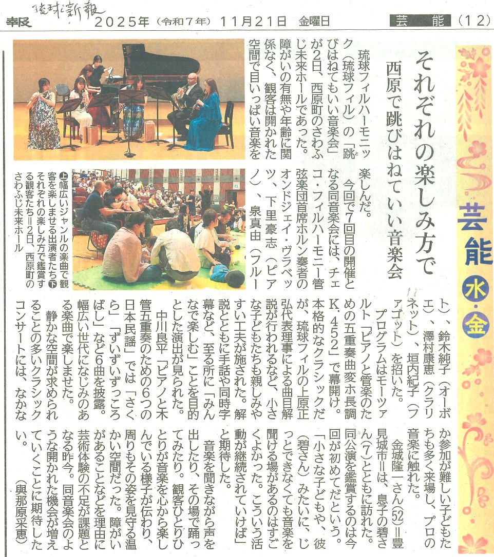 去った11月2日に 西原町町民交流センター(さわふじ未来ホール)にて「跳びはねてもいい音楽会」Vol.7を開催しました。