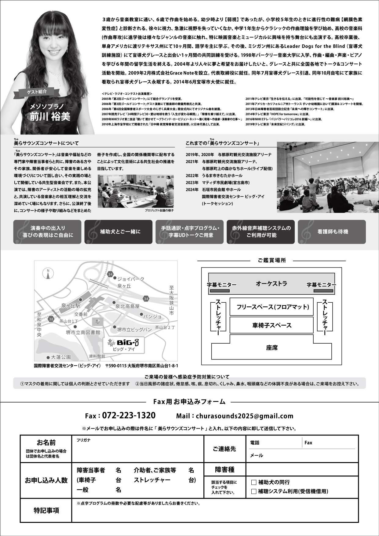 お問合わせ先&ご予約 | Tel 072-223-1312 Fax 072-223-1320 ✉ churasounds2025@gmail.com WEB予約はこちらをクリック ※FaxやMailでお申し込みの際は、お名前、連絡先、鑑賞人数、障害種、車椅子来場者数、ストレッチャー来場者数、補助犬同行、特記事項 等をご記入ください。 |